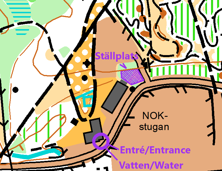 Toa och dusch, varav en handikappanpassad, finns i nedre klubbstugan. Se karta. Tillgång till toa och dusch: Efter att betalning skett, skicka ett SMS till 072 250 72 44 för att erhålla kod till nyckelskåpet som sitter till höger om entrén, nedre stugan.